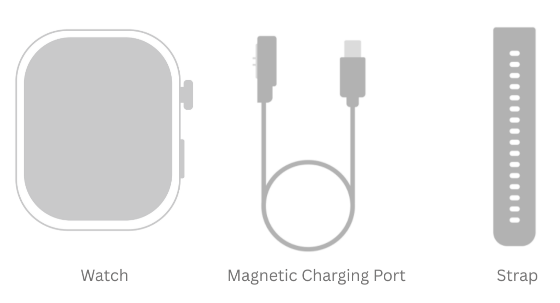 Inside the box of your Runmefit Watch, you will find: the watch, watch strap, magnetic charging cable, and user manual.