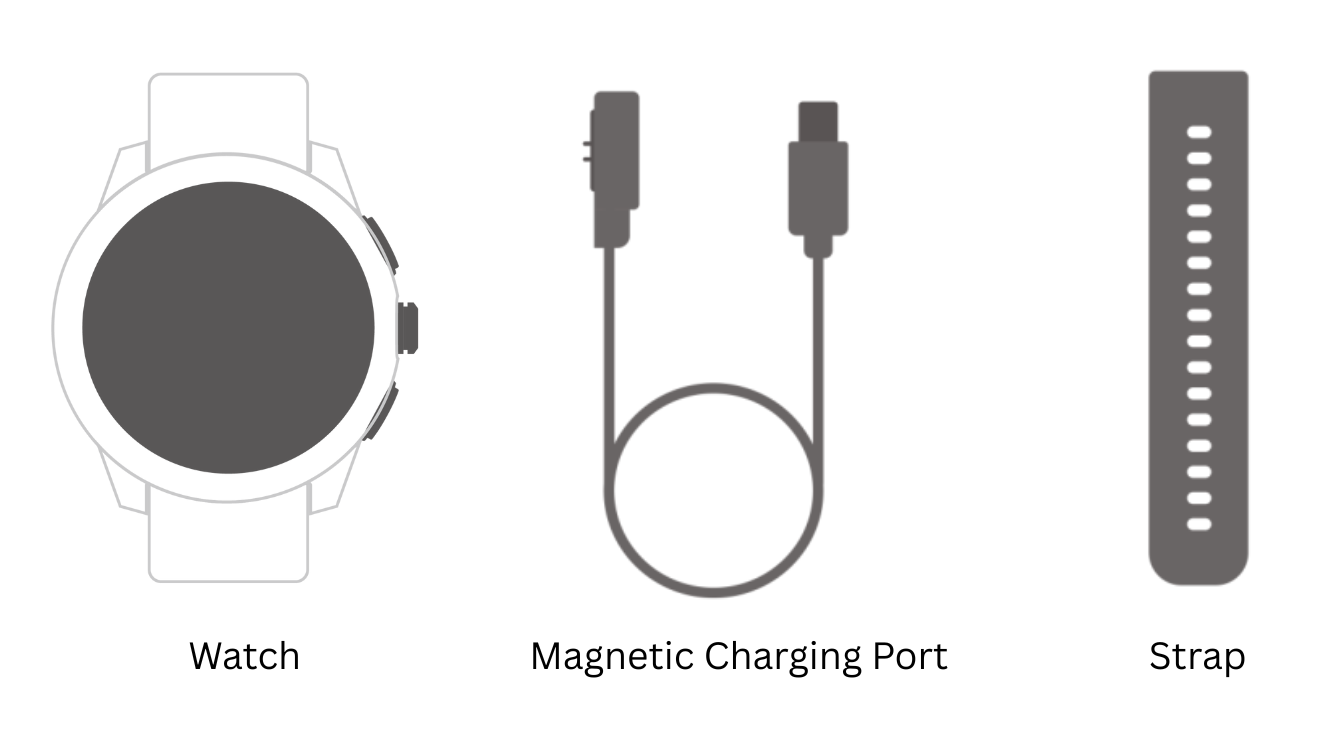 あなたの Runmefit GTR5/GTR6 パッケージには以下が含まれています:手時計、バンド、マグネット式充電ケーブル、取扱説明書。