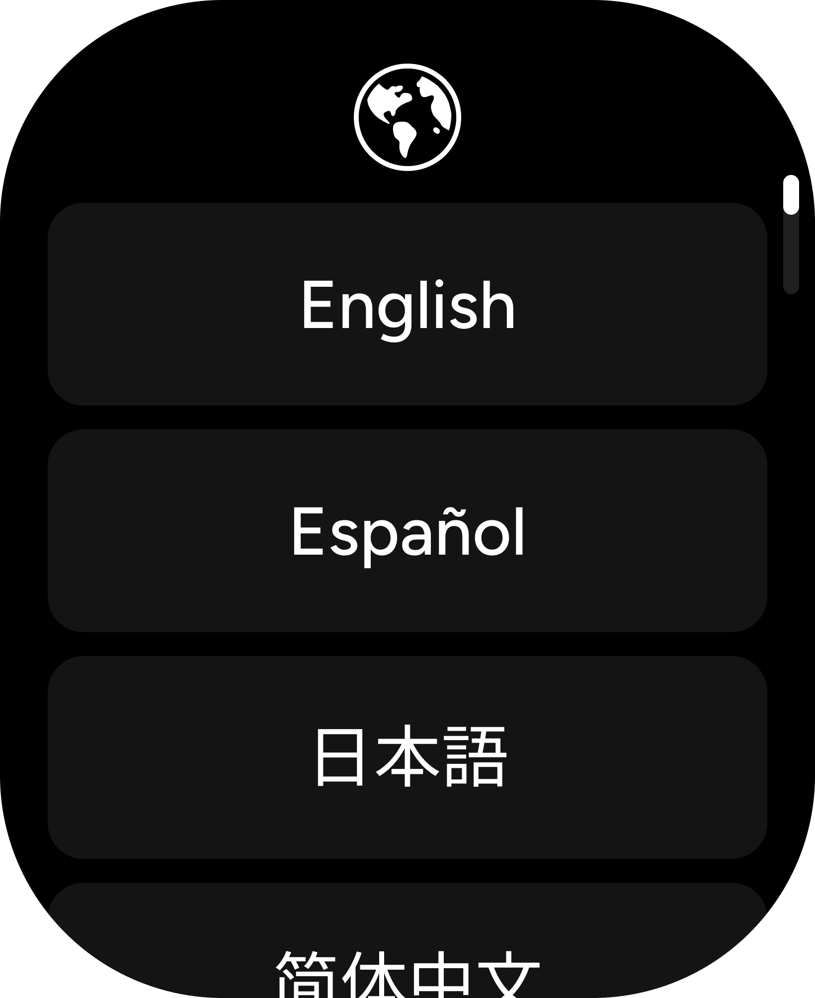 - 사용자 지정: 목록에서 원하는 언어를 직접 선택합니다. 확인 후 앱의 홈 페이지로 돌아가 아래로 당겨서 언어 설정을 시계에 동기화합니다.