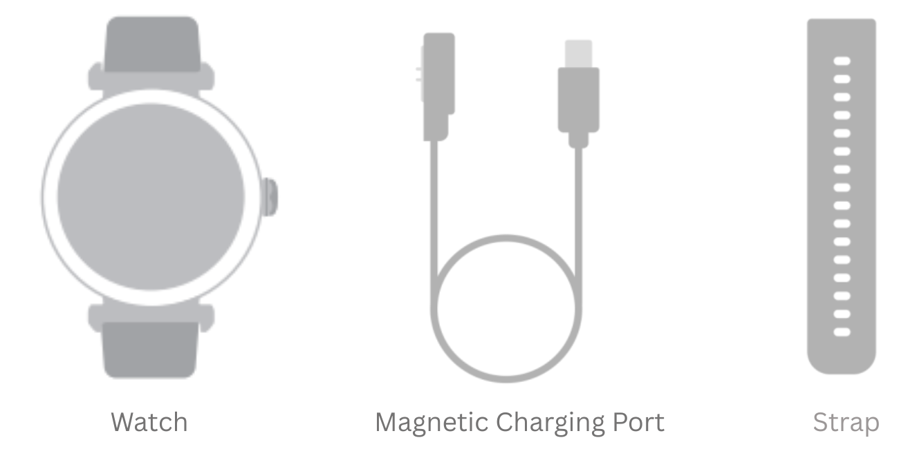 In de doos van je Runmefit Watch vind je: het horloge, het horlogebandje, een magnetische oplaadkabel en de gebruikershandleiding.