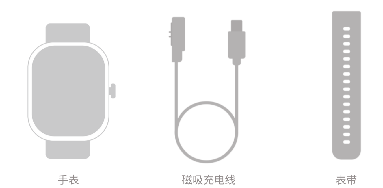 您的手表包装盒内含:手表、表带、磁吸充电线、说明书。